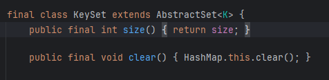 AbstractSet을 상속 하고 있었고, AbstractSet은 Set을 구현한 추상클래스 였기 때문에 IDE가 자동으로 입력해준 참조 클래스는 Set 인터페이스이며, 구현체는 KeySet 클래스를 리턴하고 있었습니다.