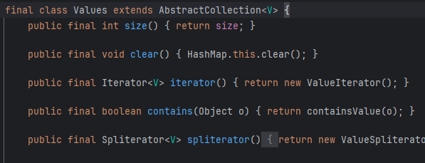 System.out.println(values.getClass()); // class java.util.HashMap$Values